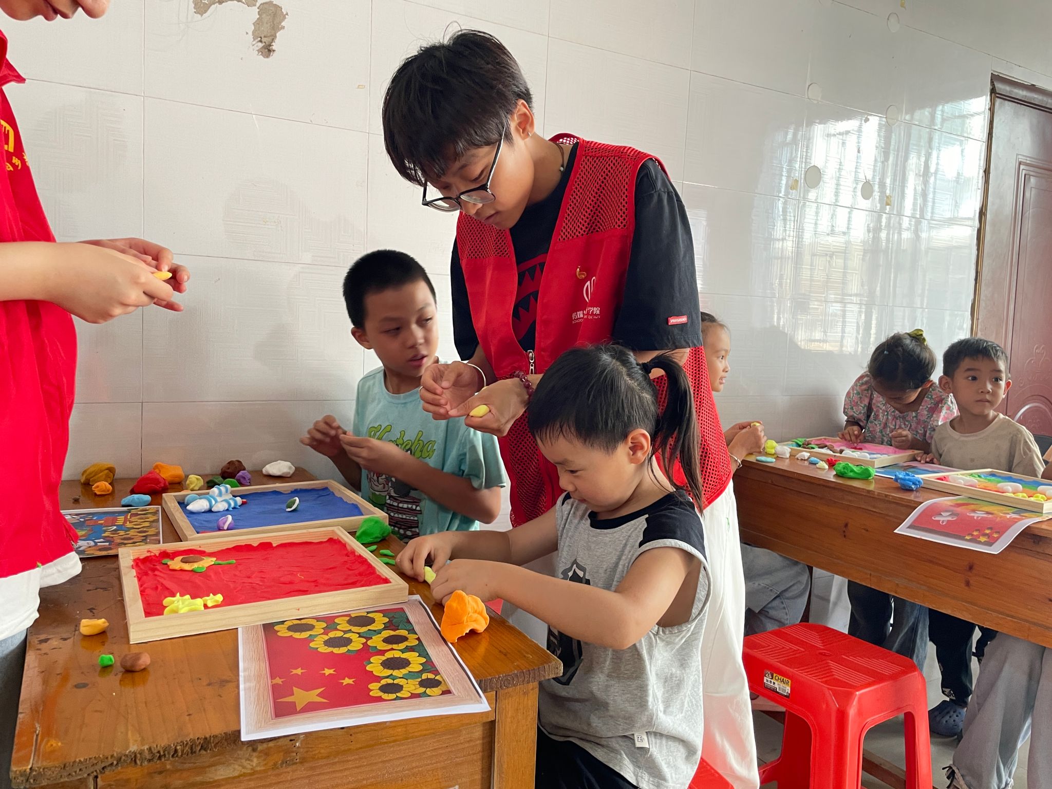 活动现场,师生志愿者们以“黏土画创作”为主要形式,引导孩子们用五彩黏土拼贴出心中的家乡图景。从青山绿水到田间小屋,从丰收稻浪到五星红旗,孩子们在志愿者的耐心指导下,用稚嫩却充满想象力的双手,将对祖国的热爱、对家乡的情感融入一幅幅立体画作中。“我做的是我们村口的大榕树,夏天爷爷奶奶都在树下乘凉。”一名五年级学生兴奋地展示自己的作品。轻松愉悦的创作氛围中,孩子们不仅体验了手工艺术的乐趣,更在潜移默化中提升了审美能力与文化认同感。