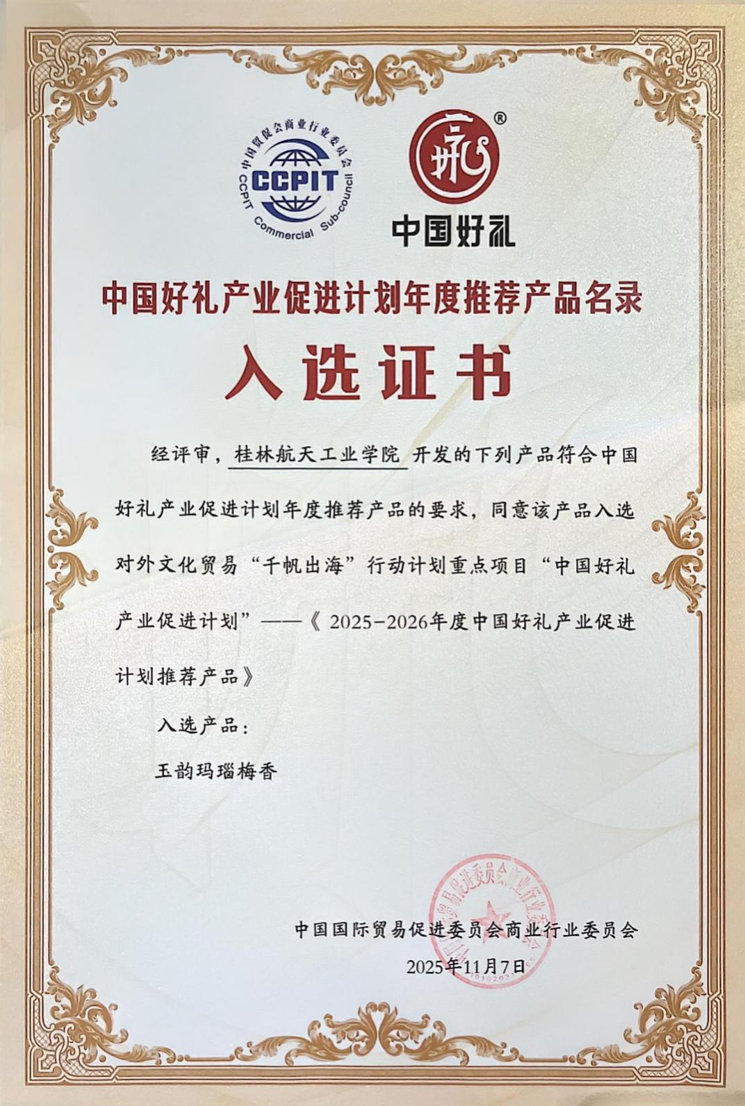 经中国国际贸易促进委员会商业行业委员会评审,我院选送的 “玉韵玛瑙梅香”作品成功入选《2025—2026年度中国好礼产业促进计划推荐产品》,并作为对外文化贸易“千帆出海”行动计划重点项目在颁奖仪式现场获颁入选证书。