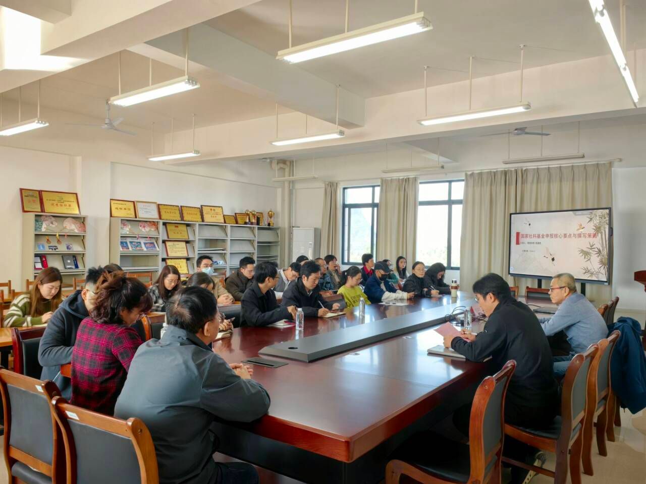 陈国民教授结合近年来国家社科基金申报的成功案例,详细阐述了申报的核心要素,并对材料撰写尤其是《申请书》与《活页》的论证部分质量做了重点讲解。最后他提出,国家社科基金作为我国哲学社会科学研究领域层次最高、影响力最广的科研基金项目,是广大社科工作者瞩目的焦点与竞逐的舞台,希望老师们能准确把握时代脉搏,立足中国大地,树立精品意识,以高质量的申报书铸就学术研究的新高度,预祝各位老师在来年的国家社科基金申报中取得优异成绩!讲座结束后,老师们拿着自己的申报材料与陈教授作了详细的请教与沟通。